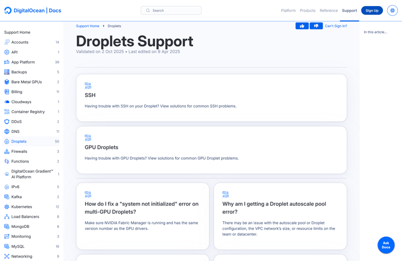 DigitalOcean's documentation is very comprehensive. The Droplets section alone contains around 50 articles, many with clear step-by-step instructions. The technical quality is high. However, images and other visual aids are often missing.