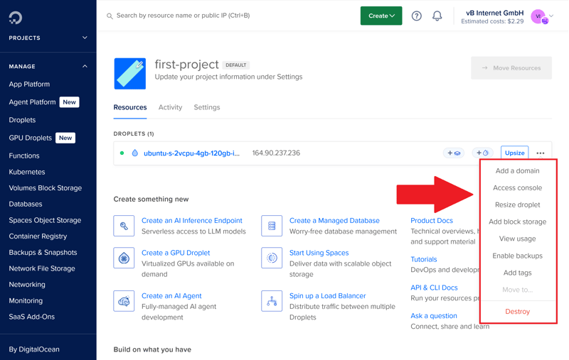 After logging in, you'll land directly in the dashboard, which offers plenty of options and information. Right from the start, you'll notice that DigitalOcean is designed for technically skilled users.
