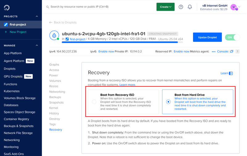 The recovery system offers significantly more options than many other hosting providers. For example, you can decide whether the VPS boots from a recovery ISO or from the internal hard drive on the next startup. This is helpful for fixing kernel errors or repairing damaged file systems.