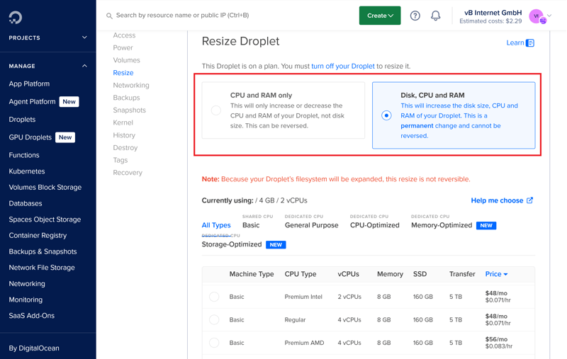 Memory: RAM ranges from 1 to 384 GB. While Basic Droplets allow flexible configurations with different RAM-to-vCPU ratios, the specialized product lines offer fixed memory ratios.