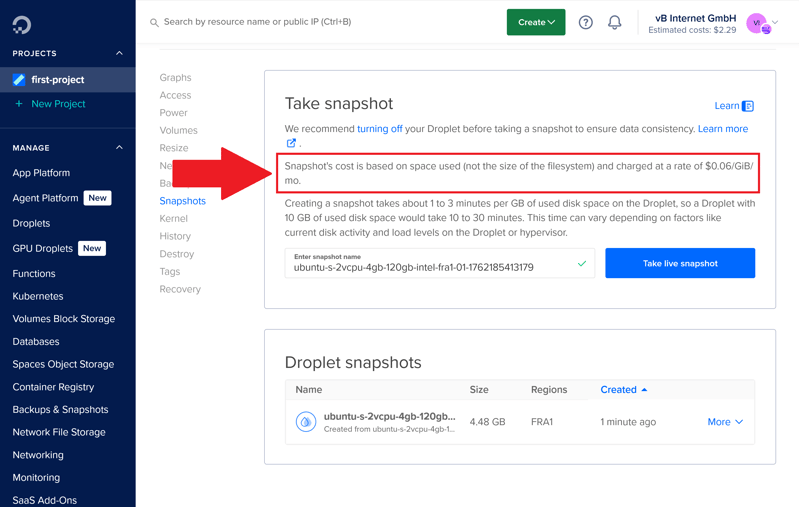 Snapshots, which are manually created images of the current system state, also cost extra at DigitalOcean. The price is based on the storage space used per month. The provider recommends shutting down the server before creating a snapshot, but this isn't strictly required.