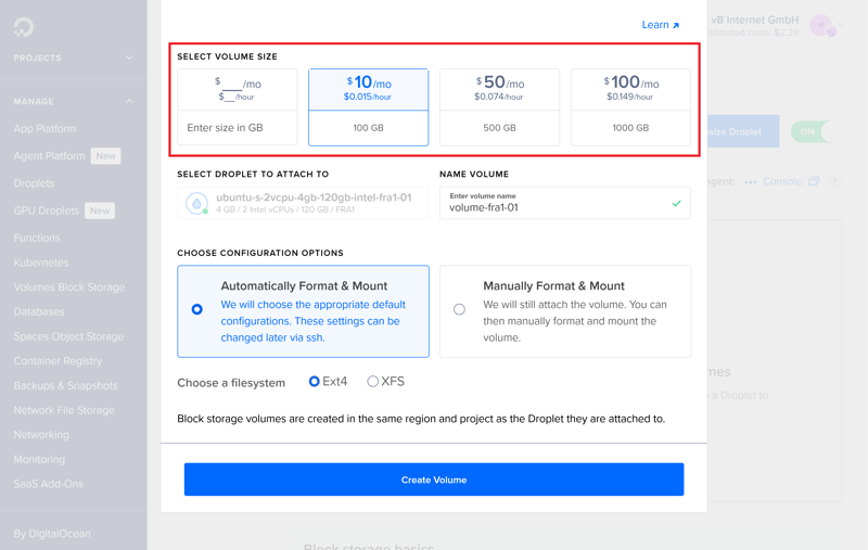In the final step, you decide whether you need additional storage in the form of Block Storage. The host attaches it to your Droplets like an external hard drive.