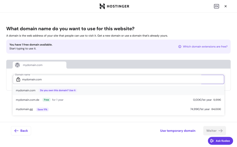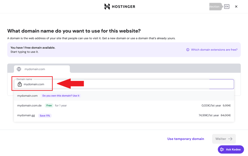 Alternatively, you can use a temporary domain from Hostinger. In that case, you’ll connect your actual domain later.