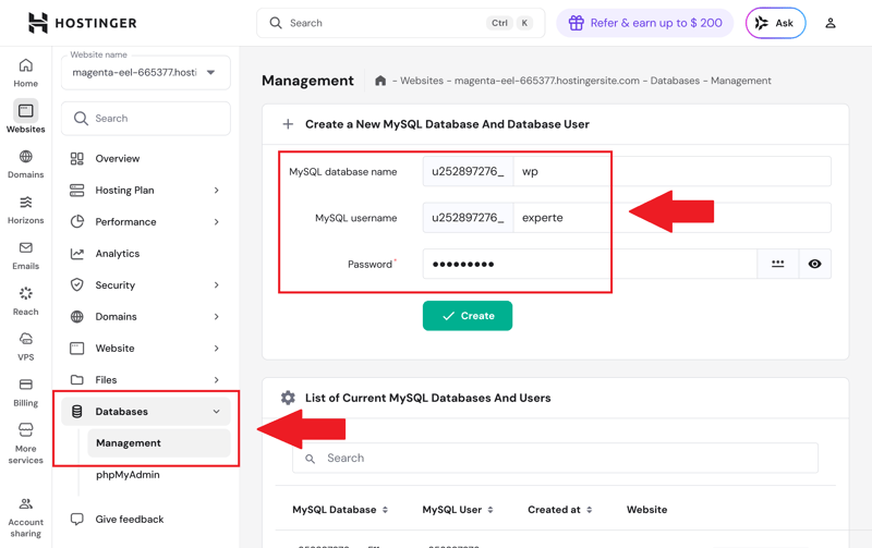 Step 3: Back in the Hostinger dashboard, go to the "Databases" section of your newly created website. Create a new MySQL database by entering a database name, username, and a strong password.