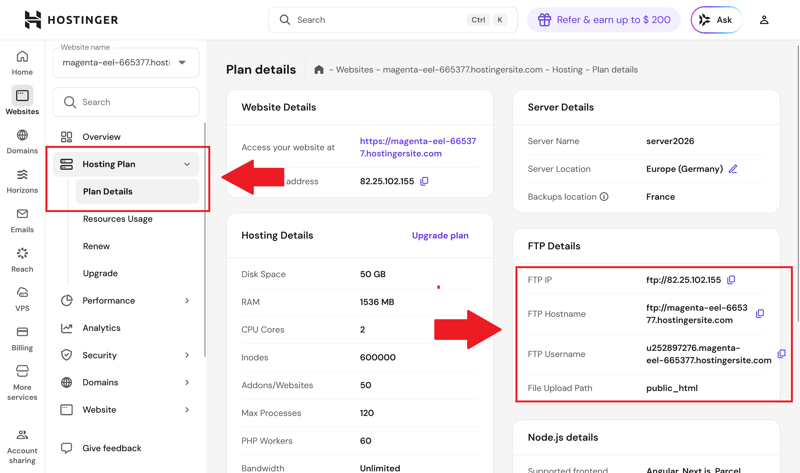 Step 4: Open the "Hosting Plan" section of your website and note the FTP credentials. The key details are the FTP host and FTP username. The FTP password is the same as your Hostinger account password unless you set a custom one.