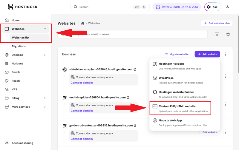 Step 1: In your Hostinger dashboard, go to the "Websites" section and click "Add Website." Then select "Custom PHP/HTML Website" to prepare for manual installation.