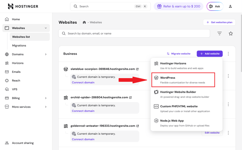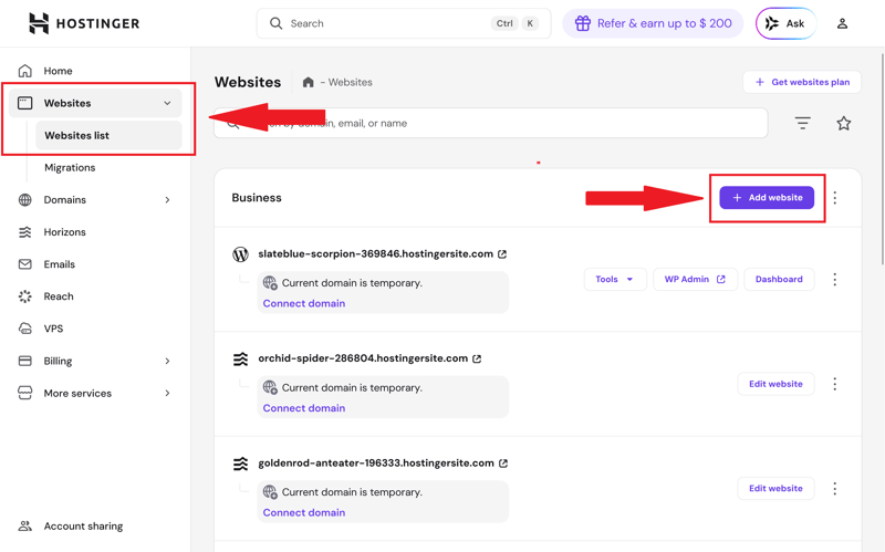 Step 1: Log in to your Hostinger account and go to the "Websites" section. Select the website list and click "Add Website" in the top-right corner.