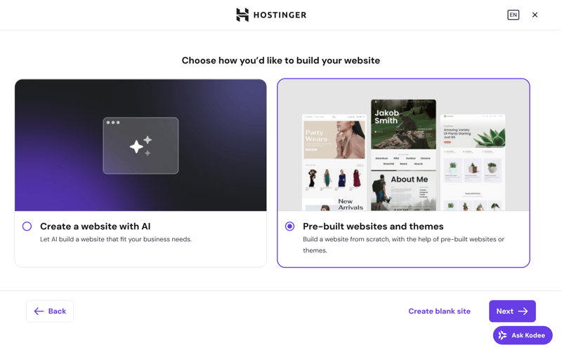 Choose how Hostinger builds your website.