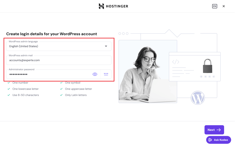 Step 3: Set up the login credentials for your WordPress admin account. Choose the installation language, enter your email address, and create a strong password.