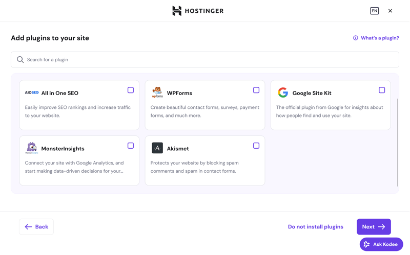 Step 6: Choose which WordPress plugins should be installed right away. You can select individual plugins or skip this step and continue without extras.