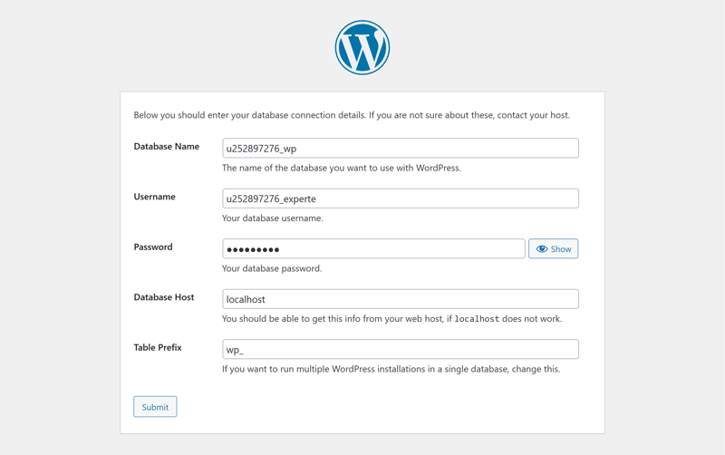 For the database host, you'll typically use "localhost". You can leave the table prefix as "wp_" unless you plan to run multiple WordPress installations in the same database.
