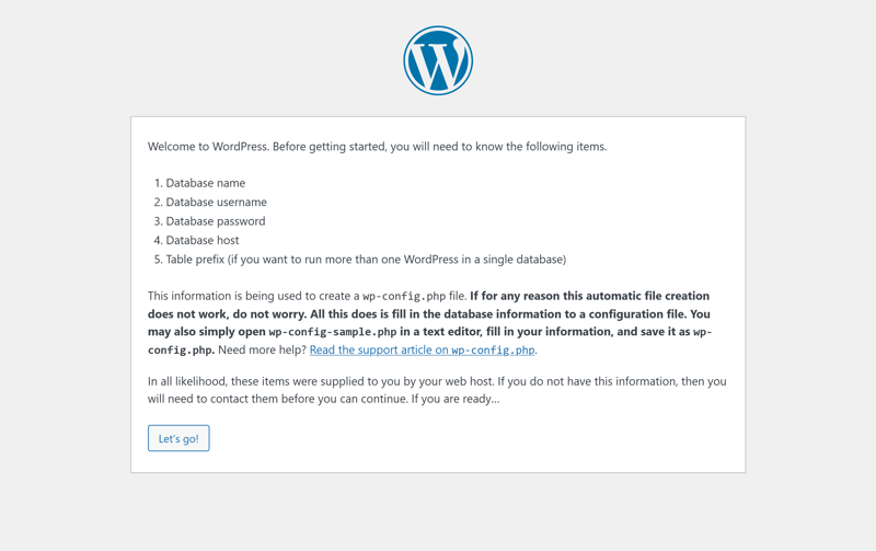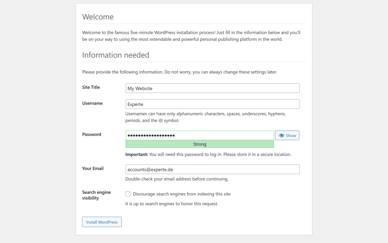 Step 7: Open your domain in a browser. The WordPress installation wizard starts automatically and shows you what information you’ll need.