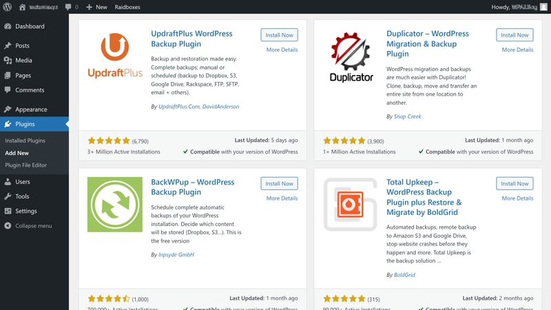 Choose a backup plugin in your WordPress dashboard, then install and activate it. For this guide, we're using UpdraftPlus.