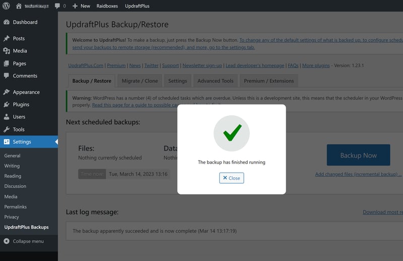 Depending on the size of your WordPress installation, the backup may take some time. Once the backup is complete, you’ll see the following message: