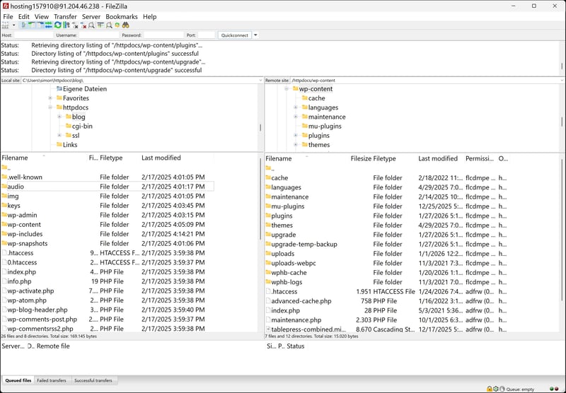 Once connected, you'll see all your WordPress files on the right side of the FTP client. Simply drag and drop them into a folder on the left side to save them to your local machine.