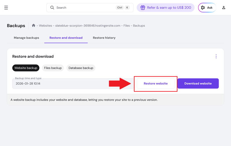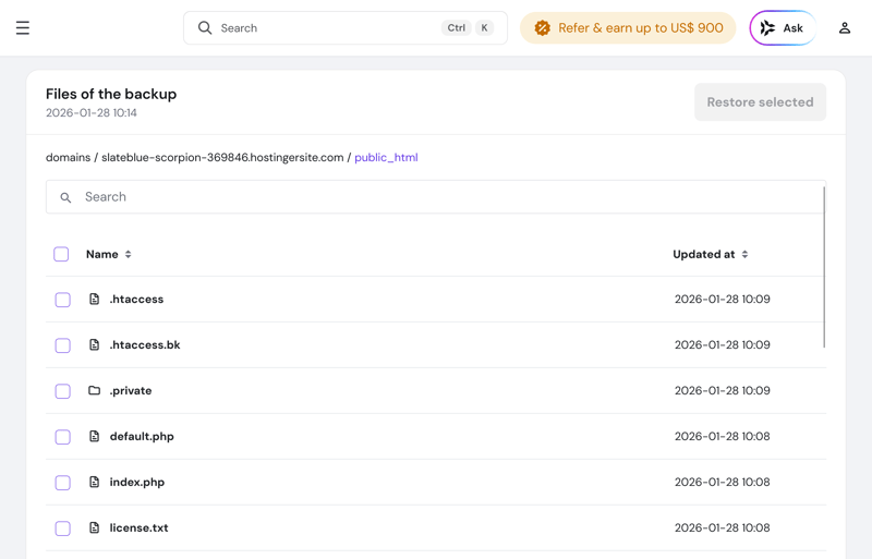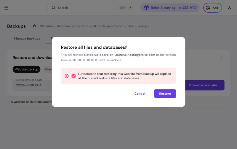 Backups from your web host can usually be restored just as quickly. Simply go to the backup section, select the backup you want, and start the restore process. Here's what it looks like with Hostinger: