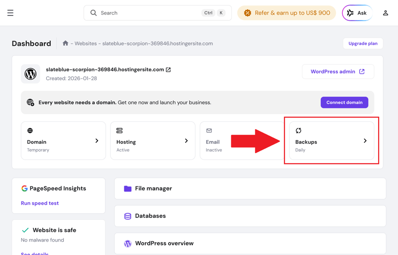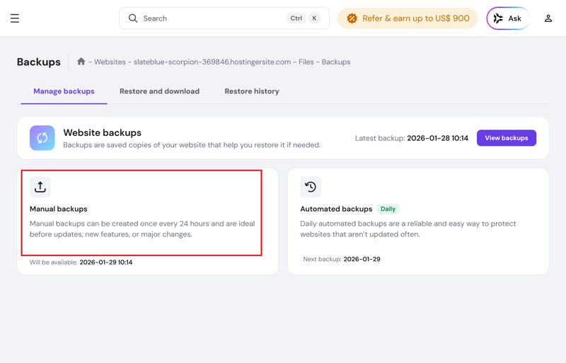 Hostinger lets you create a manual backup every 24 hours. Daily automatic backups are also available.