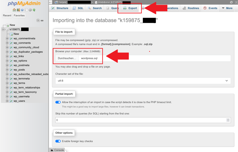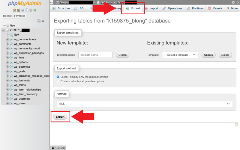 To back up the database, click the "Export" tab at the top. Select SQL as the format and choose the quick export method to export all entries.