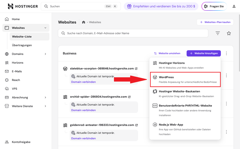 Step 1: Log in to your Hostinger account. Open your website overview and start the setup by clicking "Add Website." Then select WordPress as your platform.