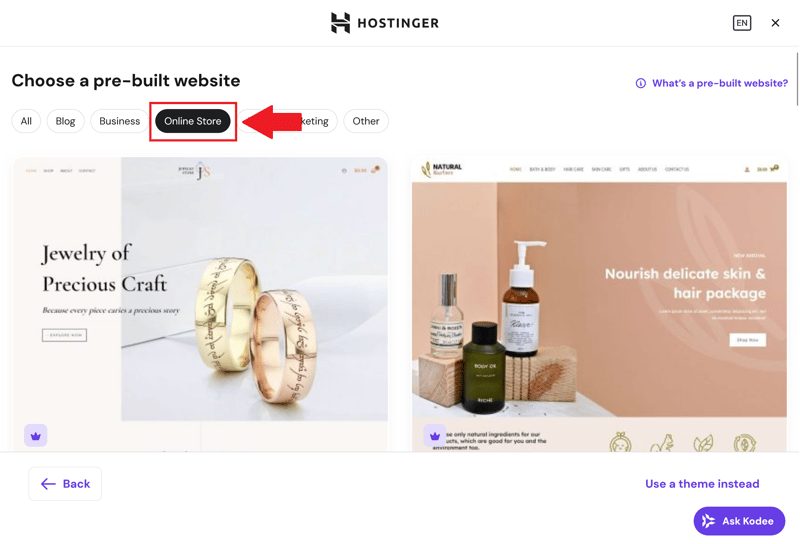 Step 4: Now pick a specific design template. This determines the visual foundation of your website, including the layout, color scheme, and typography. Hostinger also offers templates designed specifically for online stores: