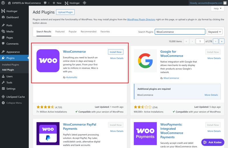In your WordPress dashboard, go to "Plugins" and click "Add New". Search for WooCommerce and select the official plugin by Automattic from the results. Then install and activate it.