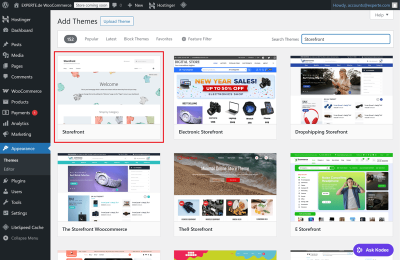 In the WordPress menu, go to "Appearance" and click "Themes," then "Add New." In the search bar, type something like "Storefront" or "Astra." Both are reliable, free themes that work great with WooCommerce.