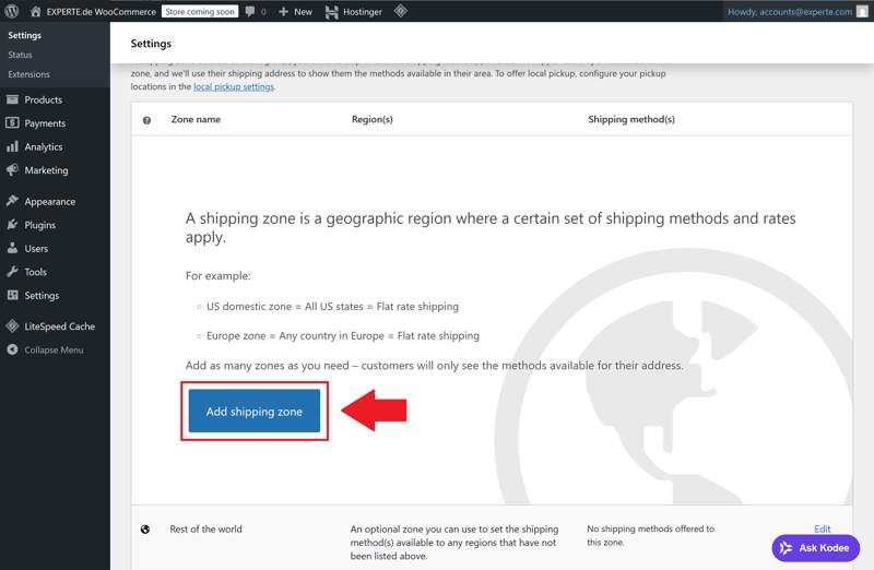In the WooCommerce menu, go to “Shipping.” Click on “Add shipping zone.” A shipping zone defines a geographic area (e.g., the United States, Canada, or Europe) that you assign specific shipping methods to.